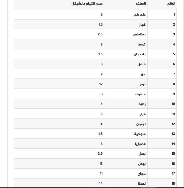 نشرت وزارة الزراعة في غزة، اليوم الثلاثاء 27 يونيو 2023 متوسط أسعار اللحوم والخضروات في السوق المحلية، مشيرةً إلى أنها يجب ألا تزيد عن الأسعار المدونة أدناه للمستهلك. وفيما يلي أسعار اللحوم والخضروات كما وردت مصدر الإخبارية: اقرأ/ي أيضاً: أسعار صرف العملات مقابل الشيكل الأحد 25- 6- 2023