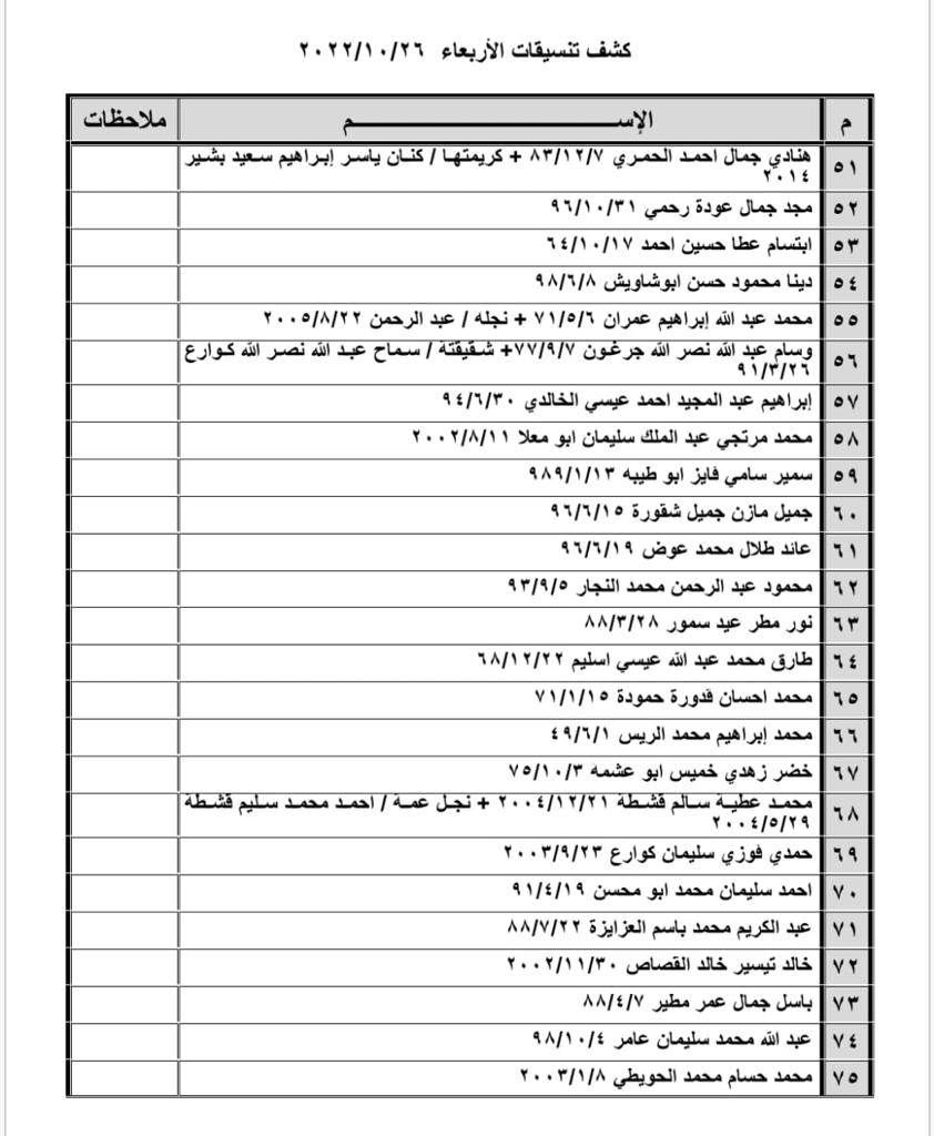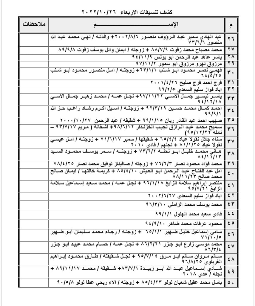 أعلنت الهيئة العامة للمعابر والحدود بوزارة الداخلية والأمن الوطني، عن وصول كشف تنسيقات مصرية للسفر عبر معبر رفح البري يوم الأربعاء 26-10-2022. ودعت “وزارة الداخلية” المواطنين الراغبين بالسفر إلى ضرورة التواجد الساعة 8:00 صباحاً في الصالة الخارجية للمعبر لتسهيل سفرهم إلى جمهورية مصر العربية. وأكدت “الداخلية”، في بيان صحفي، وصل شبكة مصدر الإخبارية نسخة عنه، على أهمية تواجد المسافرين في تمام الساعة 8:00 صباحاً في الصالة الخارجية للمعبر، مع ضرورة التزام كل مسافر بموعد سفره وفق الإعلان، لافتةً إلى أنها غير مسؤولة عن حضور أي مسافر في غير موعده. ودعت وزارة الداخلية المواطنين المسافرين إلى ضرورة إحضار كل مسافر بطاقة هويته، وتحديث بيانات جوازات السفر الصادرة حديثاً خلال عام 2022، لدى مديريات الداخلية في محافظات قطاع غزة. ونوهت “الداخلية” إلى ضرورة إحضار حجة عدم ممانعة في حال سفر أحد الوالدين مع أبنائه دون الطرف الآخر لضمان إتمام إجراءات السفر دون معيقات. وتُولى السلطات المصرية، عمل معبر رفح البري أهمية بالغة بحُكم العلاقات الطيبة والمتينة بين القياديتين المصرية والفلسطينية، التي تعززت خلال السنوات الأخيرة، نتيجة الزيارات المتبادلة، وإعلان الحرص على أمن ومصر أراضيها ومواطنيها، كما فلسطين، وتعزيز التعاون المشترك في عِدة ملفات من بينها السياسة والتجارة. جدير بالذكر أن المعبر يعمل عادةً خمسة أيام أسبوعيًا، ويُغلق أبوابه كليًا يومي الجمعة والسبت. كشف تنسيقات مصرية معبر رفح
