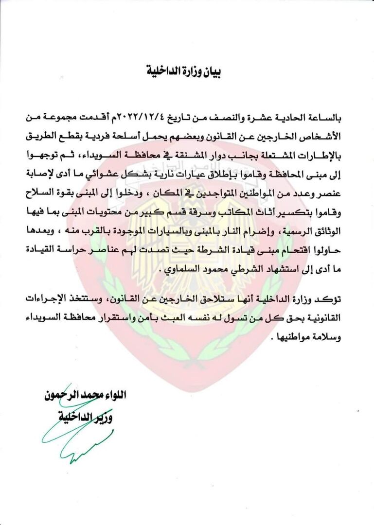 وأضافت الداخلية في بيانٍ صحفي تناقلته وسائل الاعلام، "توجه الخارجون عن القانون إلى مبنى المحافظة وأطلقوا عيارات نارية بشكل عشوائي ما أدى لإصابة عنصر وعدد من المواطنين المتواجدين في المكان، ثم دخلوا المبنى بقوة السلاح وكسّروا أثاث المكاتب وسرقوا قسم كبير من محتويات المبنى بما فيها الوثائق الرسمية وأضرموا النار بالمبنى وبالسيارات الموجودة قُربه".