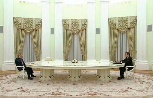 وبينت صور التقطت للرئيسين جلوس كل منهما عند طرفي طاولة متباعدين بصورة أثارت السخرية على وسائل التواصل الاجتماعي، وقال بعض الدبلوماسيين إن بوتين ربما يريد إرسال رسالة دبلوماسية من خلال هذا المشهد.