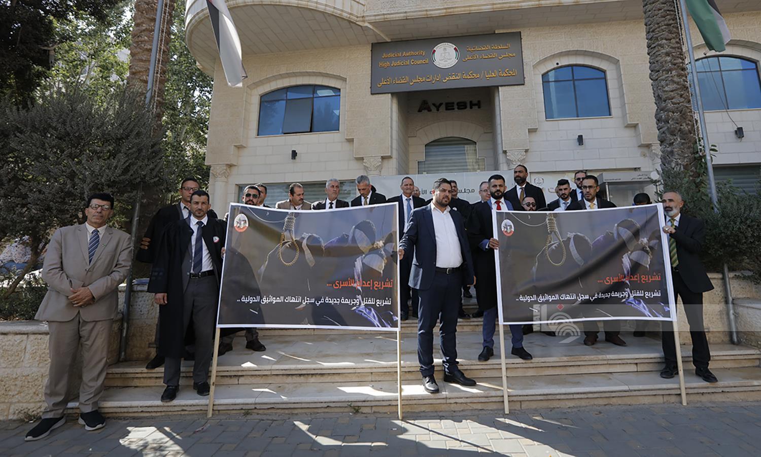نظّمت نقابة المحامين الفلسطينيين، اليوم الأحد، وقفات احتجاجية متزامنة أمام مجمعات المحاكم في عدد من مدن الضفة الغربية، بمشاركة مؤسسات أهلية ورسمية، رفضًا لمشروع قانون إسرائيلي يتيح تنفيذ أحكام الإعدام بحق الأسرى الفلسطينيين.