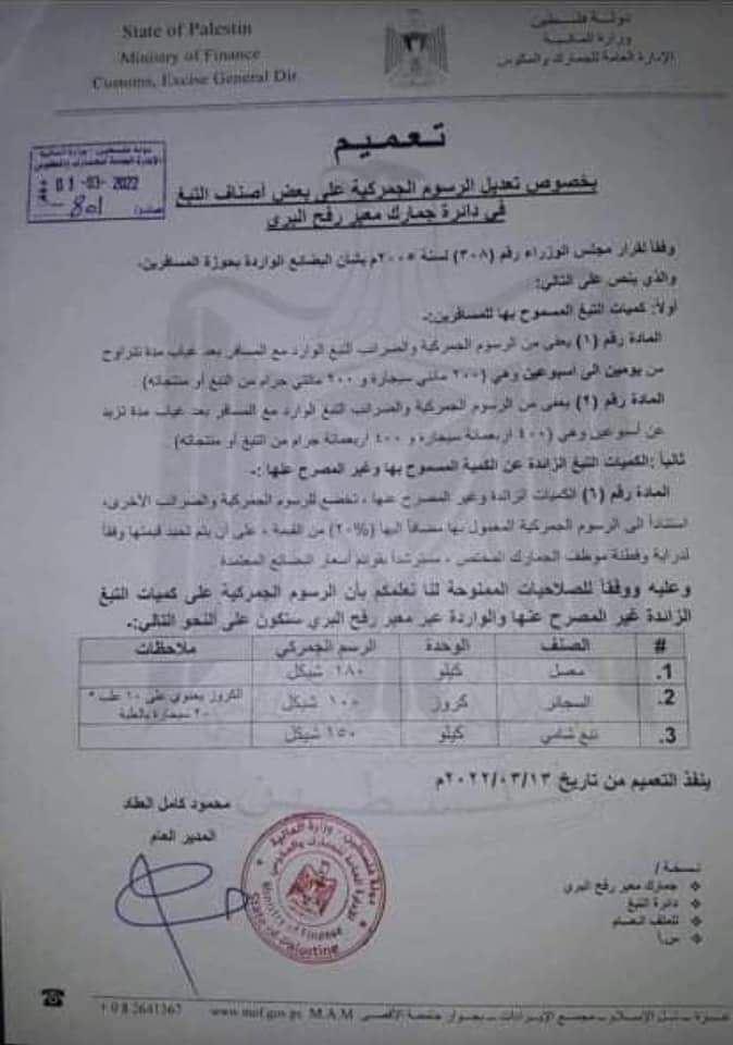 وبحسب التعميم، بلغت الرسوم الجمركية على كيلو المعسل 180 شيكل، والرسم الجمركي على (كروز) الدخان 100 شيكل، كما كيلو "التبغ الشامي" 180 شيكل، هذا بالإضافة إلى وزيادة نسبة 25% على الجمرك لكل من يحاول التهريب.