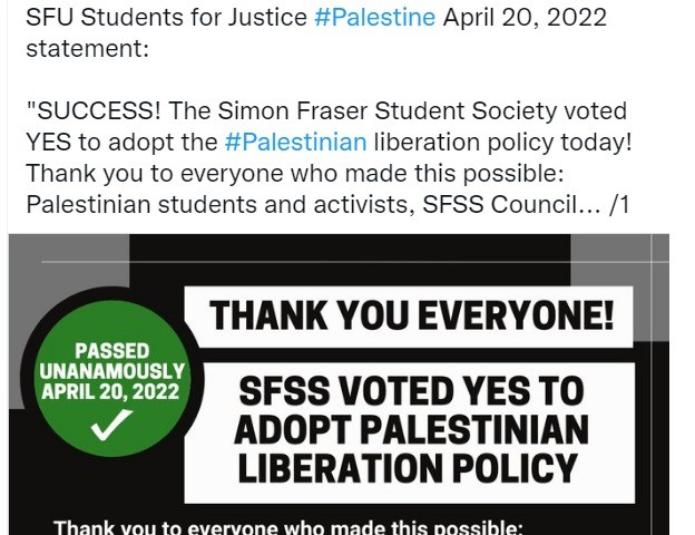 صوت مجلس طلبة جامعة "سايمون فريزر" في كندا، بالإجماع على مشروع قرار يدعم حقوق الشعب الفلسطيني غير قابلة للتصرف. ويتبنى القرار دعوة إلى "تحرير فلسطين من النهر إلى البحر" وعودة اللاجئين الفلسطينيين ومقاطعة الاحتلال الإسرائيلي وكل مؤسساته. يُشار إلى أنّ القرار يعتبر سابقة هي الأولى من حيث مضمون اللغة وطبيعة القرار، علماً أن الجامعة "سايمون فريزر" تُعد من أهم وأكبر الجامعات في كندا.