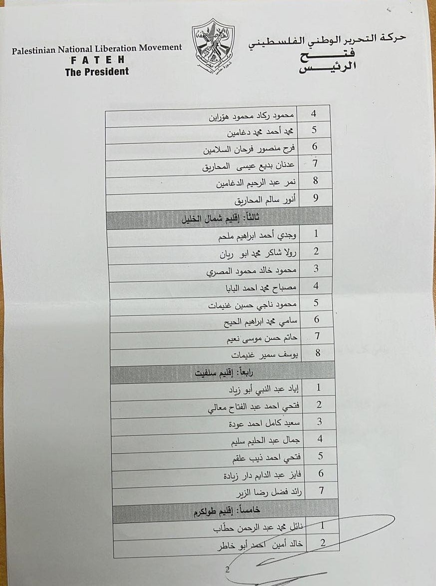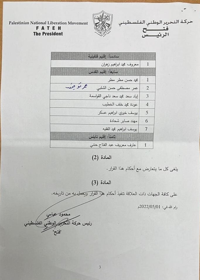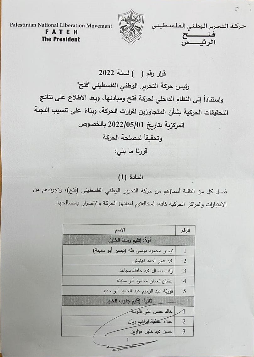 وجاء في قرار الفصل الذي وقعه رئيس حركة فتح محمود عباس: استناداً الى النظام الداخلي لحركة فتح ومبادئها، وبعد الاطلاع على نتائج التحقيقات الحركية بشأن المتجاوزين لقرارات الحركة، وبناء على تنسيب اللجنة المركزية بتاريخ 2022/5/1 بالخصوص وتحقيقاً لمصلحة الحركة قررنا: فصل كل التالية أسماؤهم من حركة (فتح) وتجريدهم من الامتيازات والمراكز الحركية كافة، لمخالفتهم لمبادئ الحركة والاضرار بمصالحها.