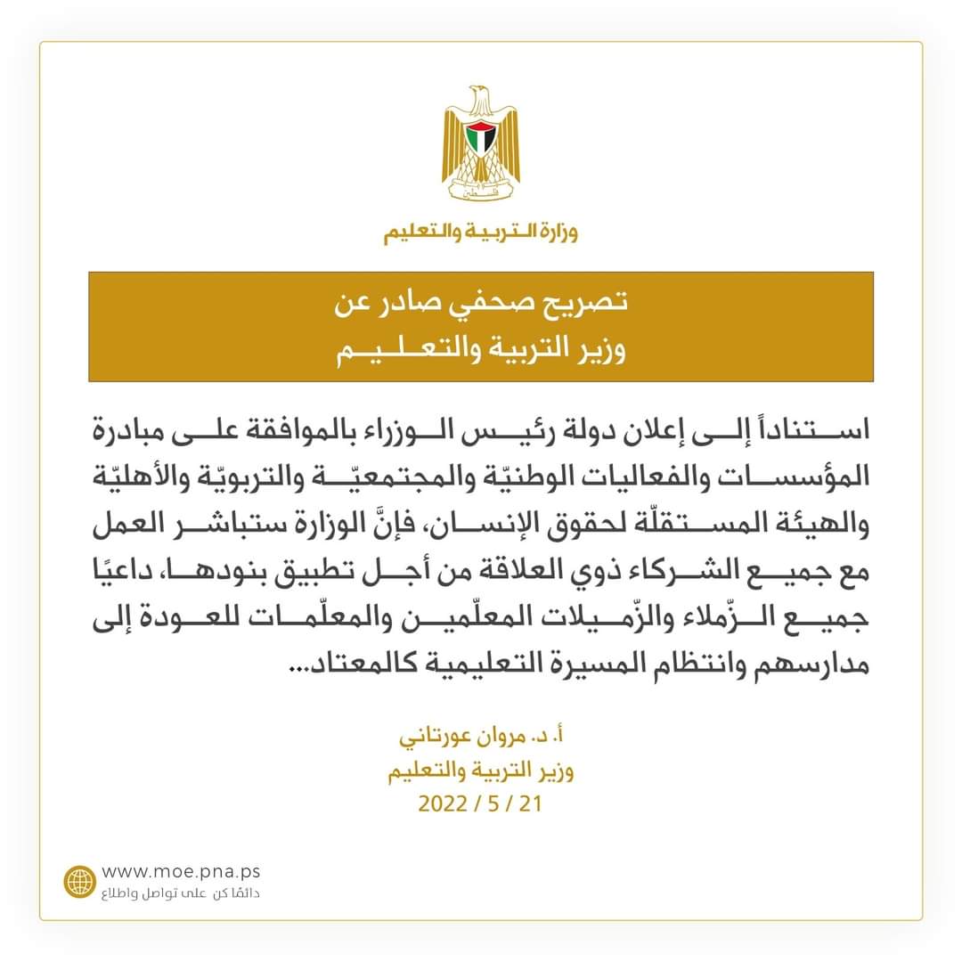 وقالت الوزارة خلال بيانٍ صحفي: "استنادًا إلى إعلان دولة رئيس الوزراء الفلسطيني د. محمد اشتية الموافقة على مبادرة المؤسسات والفعاليات الوطنية والمجتمعية والتربوية والأهلية، والهيئة المستقلة لحقوق الإنسان، فإن الوزارة ستُباشر العمل مع جميع الشركاء ذوي العلاقة من أجل تطبيق بنودها".
