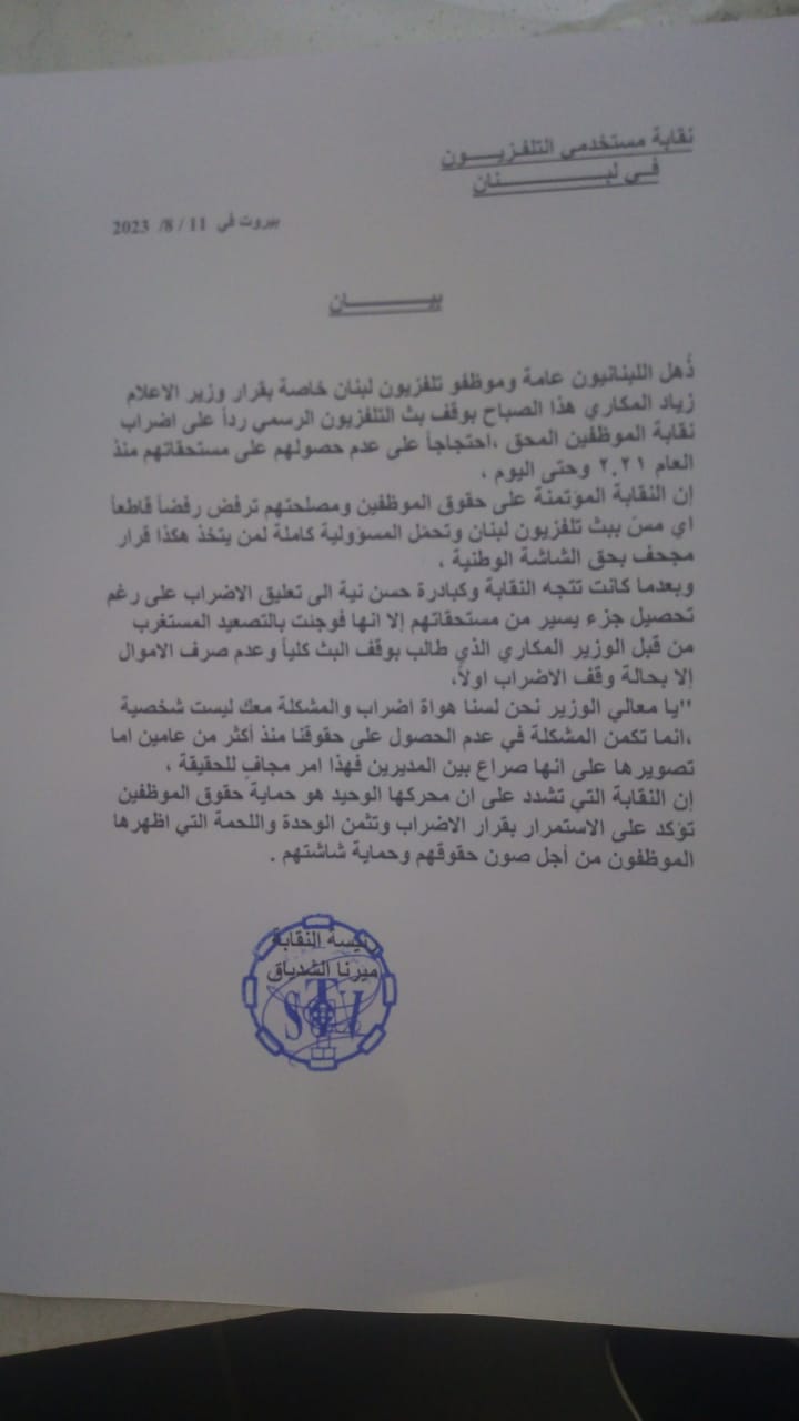 أفادت وسائل إعلام لبنانية، بأنه نقطع بثّ تلفزيون لبنان الرسمي بالكامل، والخطوط الملونة تجتاح الشاشة، وغابت المواد الارشيفية التي تُبث منذ أسبوع، أي منذ قرر الموظفون الإضراب، اعتراضاً على التسويف في دفع حقوقهم المتأخرة منذ 22 شهراً.