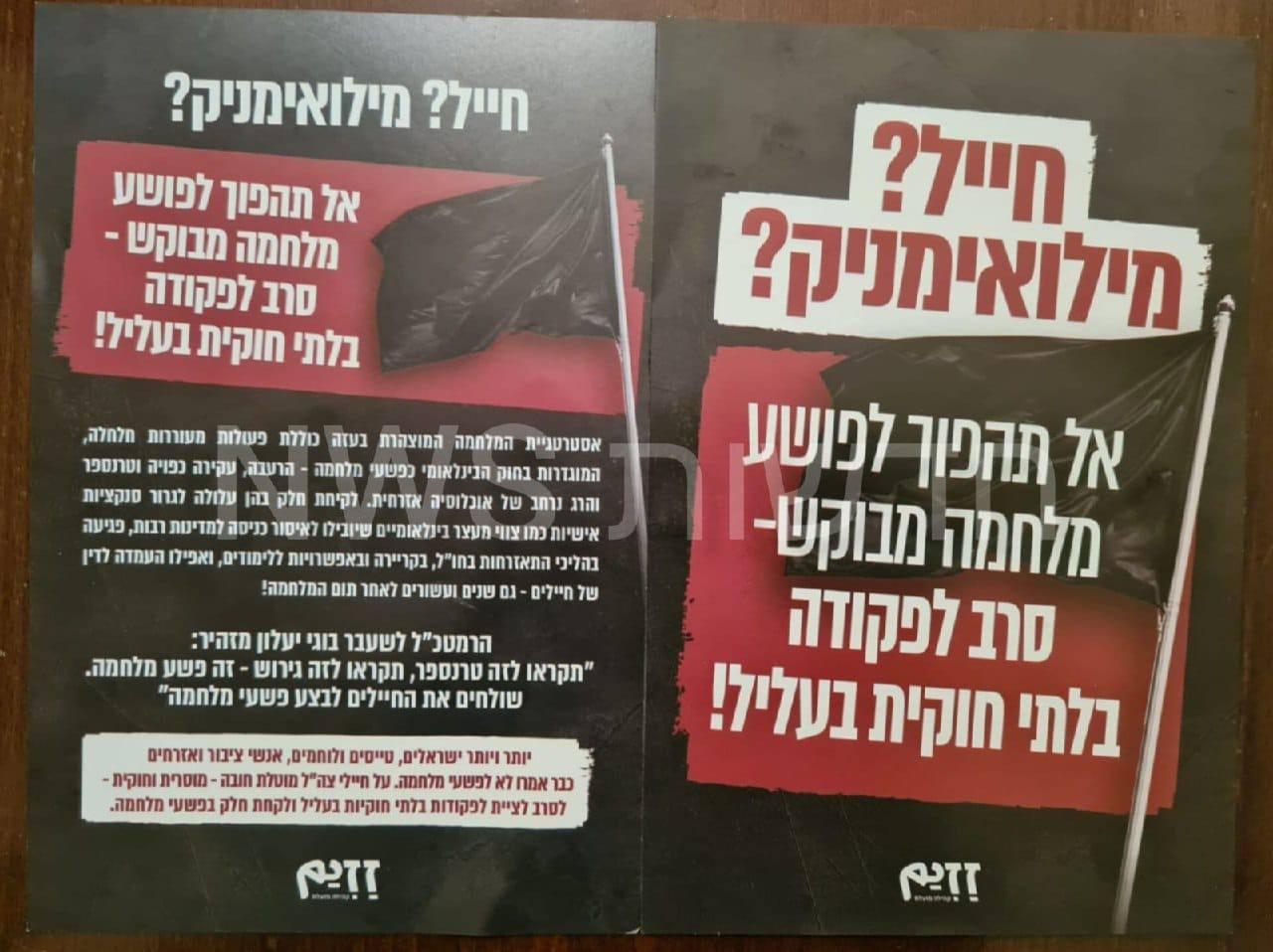 تناقل مستوطنون صوراً لبطاقات تدعو الجنود الإسرائيليين إلى رفض التجنيد سواء النظامي أو الاحتياطي في الجيش.