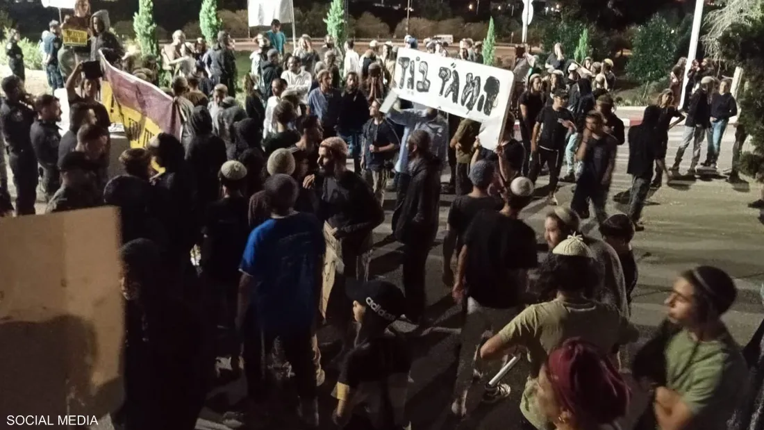وتظهر صورة من خارج القاعدة، حيث يتظاهر عشرات المستوطنين المتطرفين "بعنف"، أعضاء منهم يرفعون لافتة كتب عليها "قائد الكتيبة خائن"، في إشارة إلى قائد وحدة الاحتياط الذي اعتدى عليه المستوطنون، الجمعة.