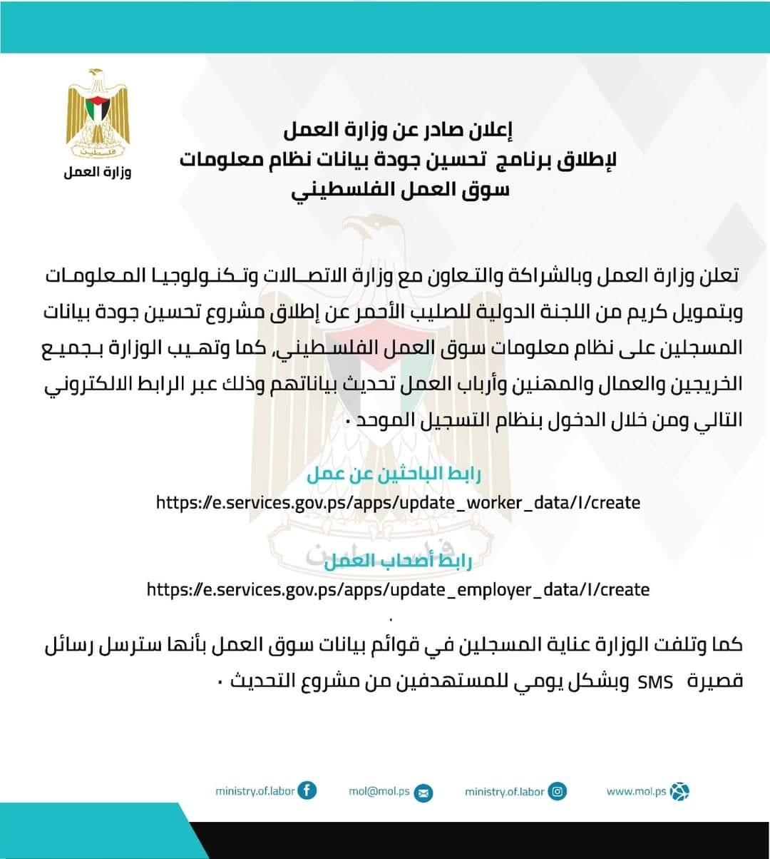 وزارة العمل في بيان لها إنها وبالتعاون مع وزارة الاتصالات وتكنولوجيا المعلومات وبتمويل من الصليب الأحمر الفلسطيني أطلقت مشروع تحسين بيانات المسجلين لدى سوق العمل الفلسطيني.