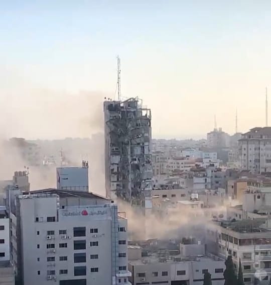 وقال مراسلنا إن انهيار جزئي أصاب مبنى برج الشروق وسط غزة بعد استهدافه بسلسلة صواريخ إسرائيلية، حيث يعرف البرج باحتوائه على مكاتب صحفية.