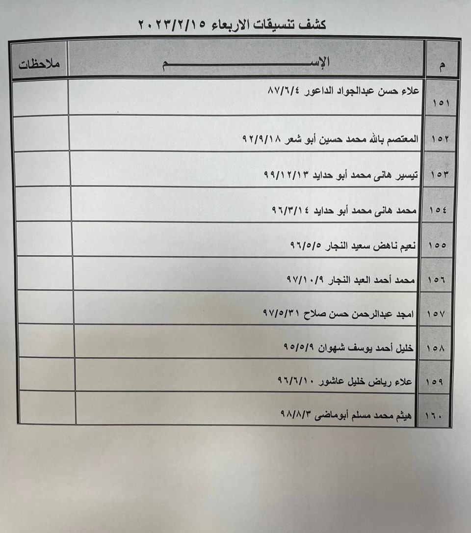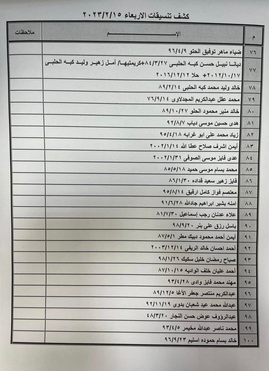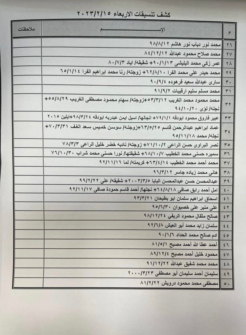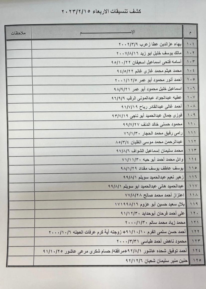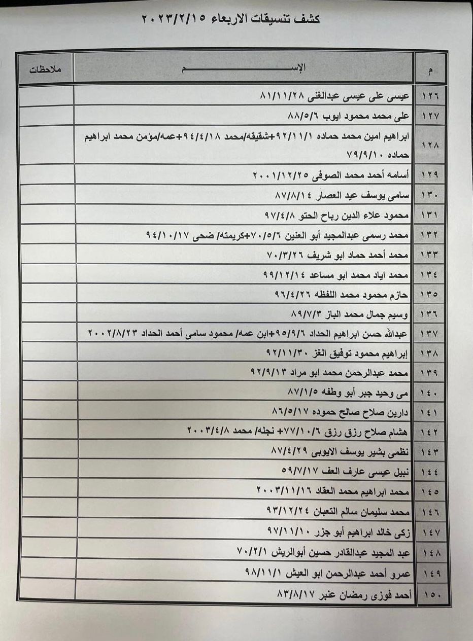 نشرت الهيئة العامة للمعابر والحدود في وزارة الداخلية بغزة، صباح اليوم الثلاثاء، كشف التنسيقات المصرية عبر معبر رفح البري، ليوم الأربعاء 15 فبراير 2023. ودعت الهيئة الأسماء الواردة في كشف التنسيقات المصرية ليوم الأربعاء 15 فبراير التواجد الساعة السابعة صباحا في الصالة الخارجية لمعبر رفح لتسهيل سفرهم. اقرأ/ي أيضاً: هيئة المعابر تنشر آلية السفر عبر معبر رفح الأحد
