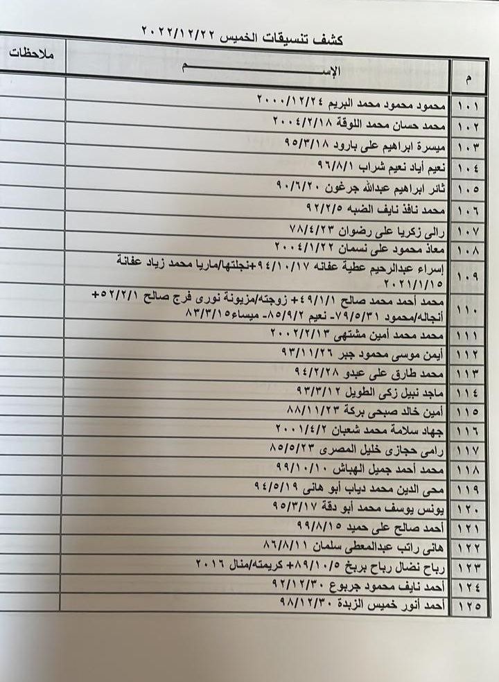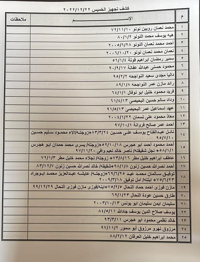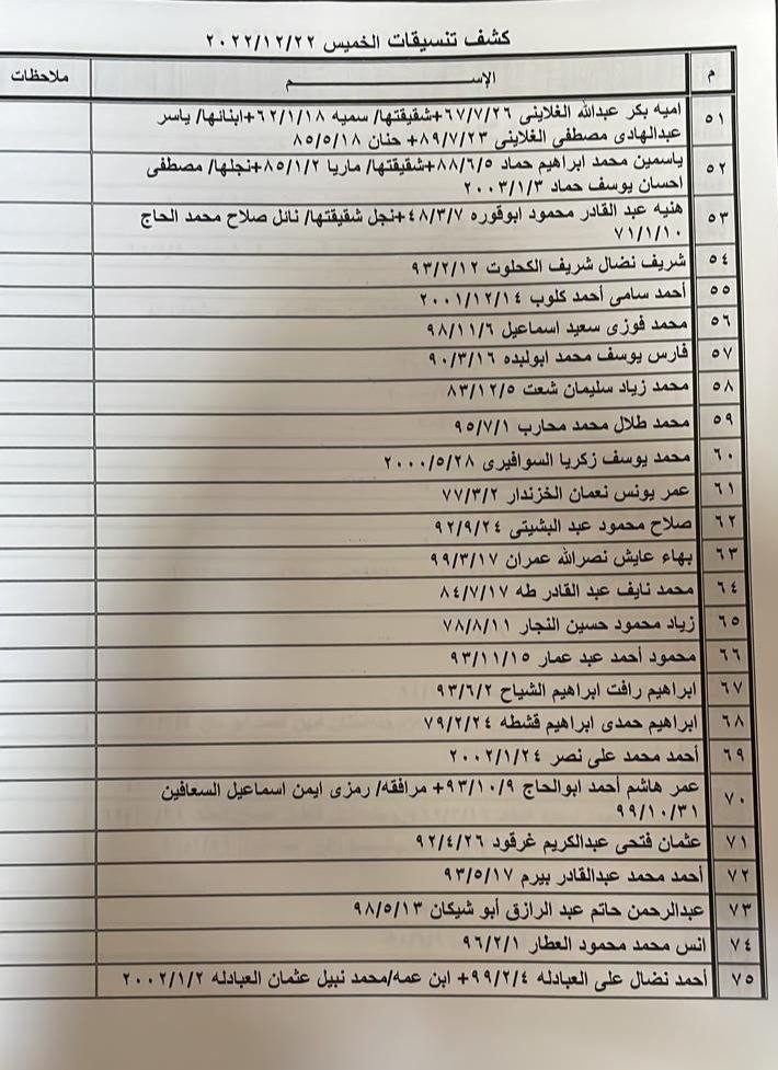 نشرت وزارة الداخلية بغزة، صباح اليوم الأربعاء كشف تنسيقات مصرية للسفر عبر معبر رفح البري يوم الخميس 22 ديسمبر 2022. وقالت الهيئة العامة للمعابر والحدود بوزارة الداخلية بغزة، إنه تم وصول كشف "تنسيقات مصرية للسفر عبر معبر رفح البري يوم الخميس (22 ديسمبر)، والذين عليهم التواجد عند الساعة السابعة صباحاً، في الصالة الخارجية للمعبر لتسهيل سفرهم. وفيما يلي كشف التنسيقات المصرية للسفر عبر معبر رفح يوم الخميس الموافق 22 ديسمبر 2022: